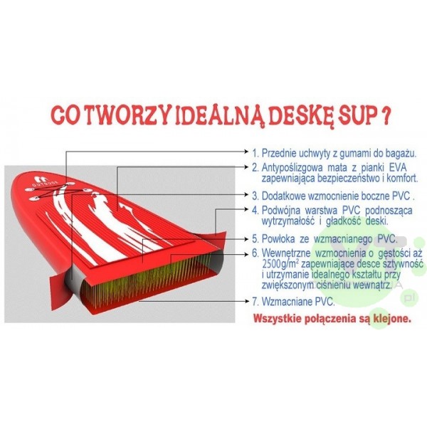 W zestawiea: - deska - wiosło - zdejmowana płetwa - pompka - zestaw naprawczy w tubie: klej i 1 łatka 3-warstwowa - torba